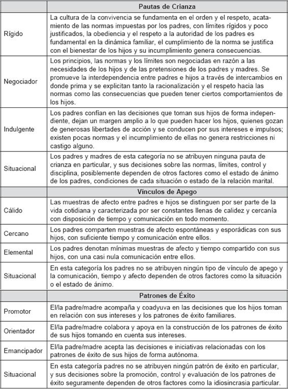Las dimensiones que desde esta perspectiva conforman el modelo parental son las pautas de crianza, aquello que es permitido o no dentro de la familia regularmente establecido por los padres y que se constituyen en normas y/o límites de comportamiento, convivencia y control en tres escenarios específicos: la familia, la sociedad y la escuela; los vínculos de apego que se refieren al afecto, el tipo o modelo de comunicación y el tiempo compartidos entre los miembros de la familia dedicado para la convivencia; y por último los patrones de éxito que abordan los campos o áreas privilegiados por la familia como sinónimo de éxito y que se manifiestan con una forma de promoción y control hacia su logro. En la Tabla 1 se describe los estilos propuestos para cada dimensión.