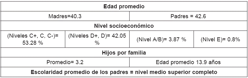 En el estudio participaron 1000 familias procedentes de 180 colonias de la capital de San Luis Potosí (México) de la zona urbana y conurbada de la misma donde se trató de incluir diferentes zonas geográficas que contemplaron todos los niveles socioeconómicos conceptualizados en este estudio.