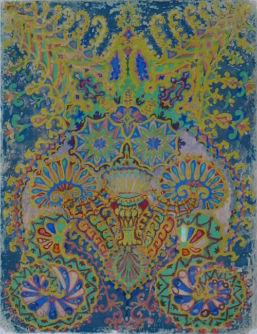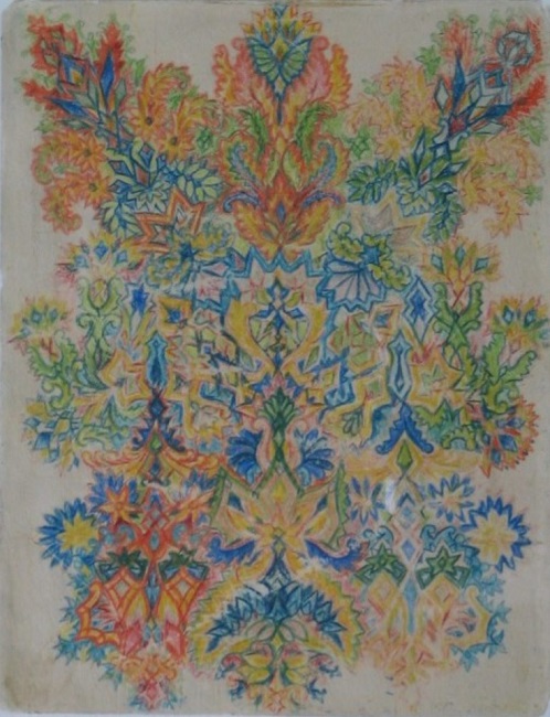 La figura va perdiendo unicidad para irse perdiendo en una combinatoria de colores, en un estilo más intrincado y como mencionamos, apuntando a lo que podría considerarse un arte psicodélico en el sentido de sus características: patrones fractales, caleidoscópicos, de colores brillantes, con estilización en los detalles. Mutación de patrones y objetos que incluso transmiten la sensación de un collage contrastante, en el sentido también de cómo el esquizofrénico arma una imagen de sí, como un conglomerado de pedacitos, de piezas, como un lugar desordenado.