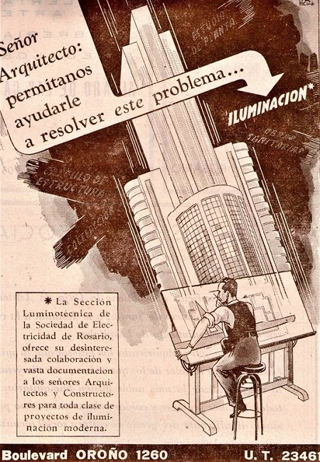 Paralelamente, Warecki trabajó desde los años treinta realizando publicidades gráficas para distintas empresas de la ciudad. Algunas de las imágenes elaboradas para la Sociedad de Electricidad de Rosario y La Comercial de Rosario fueron publicadas en el Boletín (figura 10). Como señalamos en otro texto, la representación de la ciudad industrial, el desarrollo de habilidades técnicas y la fantasía de la electrificación fueron algunos de los motivos desplegados en las publicidades para la compañía eléctrica, 17 mientras que para las empresas albergadas en La Comercial se destacaron las vistas del moderno edificio o las imágenes referidas a las posibilidades que podía generar la obtención de un crédito. Si bien las vistas arquitectónicas para La Comercial no están firmadas por Warecki, el artista realizó otros anuncios para las sociedades mercantiles desarrolladas en ese espacio, que había albergado una compañía de seguros, una empresa financiera y departamentos de renta, siguiendo la estética racionalista moderna. Junto a esos avisos propagandísticos dispersos en distintos diarios de la época, también dibujó fachadas de edificios para revistas, lo que nos permite pensar que estas imágenes podrían ser de su autoría. Los últimos números del Boletín incorporaron, asimismo, algunos trabajos para la Sociedad de Electricidad de Rosario que parecieran ser del artista, aunque tampoco poseen una firma visible.