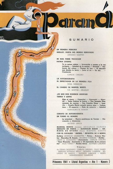 En paralelo a la labor desplegada en Boletín, entre 1941 y 1943 Montes i Bradley dirigió la revista Paraná que se desarrolló en cuatro gruesos volúmenes impresos en papel obra y tapas de cartulina, con una tirada que rondaba entre 1500 y 1600 ejemplares y una distribución iniciada de manera trimestral en el invierno de 1941, aunque interrumpida al año siguiente hasta el otoño de 1943, cuando salió el último tomo con cuatro números juntos. La revista se imprimó en los Talleres Gráficos de Emilio Fenner, el cual tuvo a su cargo otras publicaciones del escritor.21 El lema consignado en la solapa interior de la revista: “Paraná, columna vertebral del litoral. Rica vena, tenso nervio, clara voz de Argentina intelectual. Corrientes, Chaco, Entre Ríos, Formosa, Misiones, Santa Fe, diciendo sus inquietudes”, daba cuenta de un vasto territorio geográfico vinculado a la obra de autores provenientes de la amplia zona del litoral argentino.