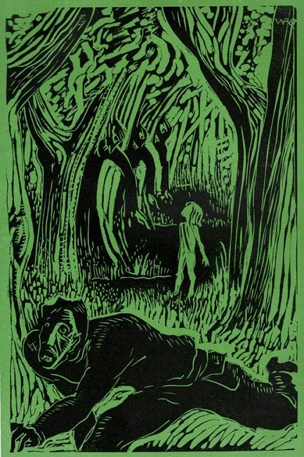 En relación con esas reproducciones, el resto de las imágenes cumplía una función ilustrativa extendiendo el sentido de los textos, añadiendo nuevas significaciones derivadas del universo imaginario del artista o presentando a los escritores y su obra a través de pequeñas caricaturas. Algunas de las viñetas apelaban a los recursos y motivos provenientes de la gráfica expresionista y surrealista exhibiendo atmósferas oníricas, ojos mutilados y cuerpos amorfos mediante el uso de líneas distorsionadas y formas exageradas, que funcionaban como un contrapunto de las narraciones basadas, por lo general, en la descripción de paisajes, ambientes, tipos y costumbres del Litoral. Sin distanciarse completamente de este mundo referencial, otro tipo de textos incursionaban en el misterio, recreando las posibilidades narrativas que ofrecía la vivencia interior de los personajes o el gusto por la aventura, la fantasía y el horror. En diálogo con este tipo de relatos Warecki volvió a ilustrar un cuento de Luis María Albamonte para el volumen de 1943 mediante un grabado en linóleo. En la imagen para “La terrible mentira de Sámbur” (Figura 12), los trazos gruesos y sueltos, las formas angulosas y los surcos de la superficie recuerdan a las xilografías de algunos expresionistas alemanes como Ernst Ludwig Kirchner y Karl Schmidt-Rottluff. El grabado fue impreso sobre una lámina de un verde profundo, prolongando la imagen de una naturaleza que se transforma en un paisaje terrorífico con troncos astillados y árboles antropomorfos, en donde lo humano se entrecruza con lo vegetal. Esa dimensión imaginaria sintoniza con las temáticas desarrolladas en algunas piezas de la gráfica expresionista que se inspiraron en los relatos de terror de la infancia en los dibujos infantiles de los cuentos populares y en los íconos primitivos rusos.26
