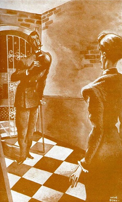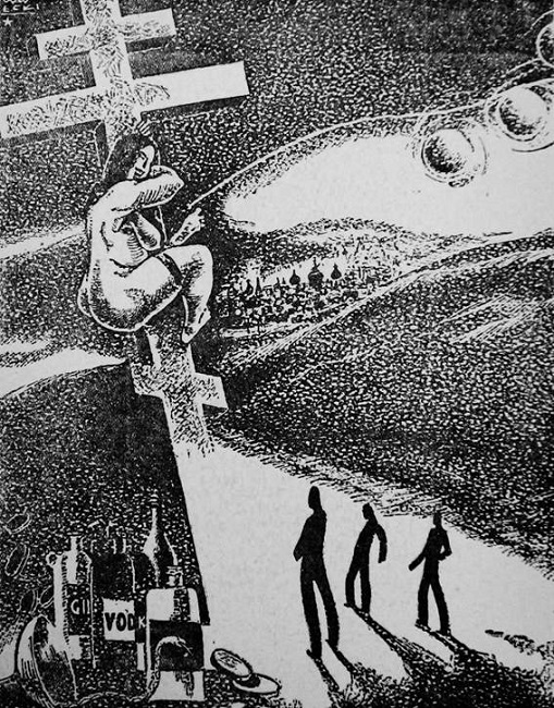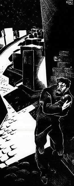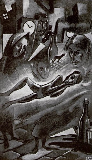 El texto concluye cuando el supuesto delincuente simpatiza con el niño y se detiene a jugar con él hasta que llegan los familiares y vecinos con palos y puños amenazantes y, creyendo que iba a estrangularlo, “no pudieron dominar su indignación y lo lincharon…”. La imagen despliega visualmente parte de la historia, pero también se relaciona con la temática de la marginalidad urbana que aparece de manera frecuente en la gráfica de Warecki. La noche constituye el momento preferido en estas representaciones a partir de ambientes que evocan los mundos inferiores y los bajos fondos en los bordes de la ciudad. Son por lo general escenarios habitados por vagabundos, delincuentes, borrachos y prostitutas que deambulan por las calles solitarias. Esa misma mirada de la urbe como espacio del pecado, la violencia y la desigualdad puede verse en la ilustración para el libro La ronda de los candiles, publicado por Félix Molina Téllez, en 1938. Allí una voluptuosa mujer desnuda se aferra a una cruz ortodoxa al resguardo de unos hombres que la acechan en medio de una noche de taberna en la fría Rusia (figura 8). Las botellas de vodka, las copas, la serpiente y las monedas hacen referencia al mundo de los prostíbulos donde los placeres carnales se aunaban con otros goces masculinos como el tabaco y el alcohol. En ocasiones esas composiciones de Warecki podían emparentarse con ciertas formas de la iconografía surrealista que mostraba los recodos de la metrópoli con sus objetos enigmáticos y terroríficos. André Bretón se refirió en distintas oportunidades a este redescubrimiento de los espacios urbanos ocultos del racionalismo arquitectónico: “La calle con sus inquietudes y miradas era mi verdadero, elemento: en ella como en ningún otro lugar yo tomaba el aire de lo eventual”.14 Ricardo Warecki se acerca a aquella visión surrealista de la ciudad donde los seres marginales habitan rincones prohibidos que, a su vez, son los mismos escenarios imaginados por los autores en los cuentos y poemas publicados.