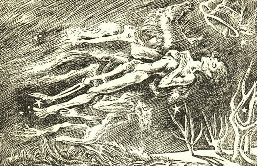 La figura femenina sostiene una estrella luminosa que parece estar a punto de escapársele de entre los dedos por la velocidad con la que avanza sobre un caballo, animal vinculado al planeta Marte, cuya visión se considera presagio de guerra.30 También aquí el artista recurre aimágenes fragmentarias para ilustrar distintas partes del texto en donde los límites de la pampa configuran el escenario de una tragedia. Unos años antes el artista había representado a una mujer sobre un caballo para la tapa del libro Horas del alma, de Aristide F. J. Maañón, pero en ese caso el enorme reloj del fondo relacionaba la escena con el paso del tiempo.