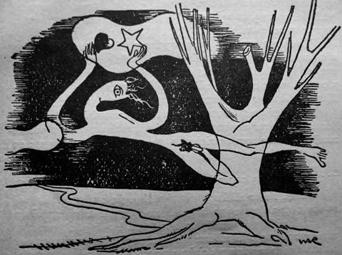 En ese mismo número de la revista Warecki realizó dos ilustraciones a tinta para el texto “Momentos de la muerte transparente” de Félix Molina Téllez (figuras 14 y 15), una de ellas luego reimpresa en el libro con el mismo título que el autor publicó en 1949 con láminas de Pelissier.29 En la imagen principal aparecen seres cadavéricos e informes suspendidos en un paisaje de troncos y ramajes secos junto a un campanario y una mujer desnuda con su cuerpo torsionado y los cabellos al viento.