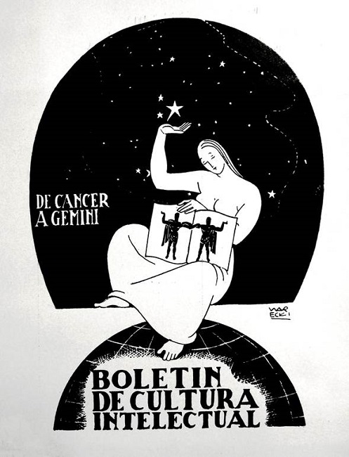 El Boletín de Cultura Intelectual editó 24 ejemplares durante su primera etapa comprendida entre junio de 1938 y octubre de 1943, y otros cinco números entre enero de 1944 y septiembre de 1947. La edición fue suspendida en distintos momentos, aunque inicialmente tuvo una periodicidad mensual que no pudo sostener en el segundo tramo de la publicación. Desde noviembre de 1938, y a lo largo del primer ciclo, cada nueva entrega llevó consecutivamente los nombres de los signos del Zodíaco junto a pequeños dibujos de Leónidas Gambartes realizados en una o dos tintas.6 Entre los artistas que participaron con viñetas e ilustraciones, Ricardo Warecki se encargó de diseñar el emblema que identificaría a la publicación: una mujer de apariencia clásica con el torso desnudo en alusión a las divinidades griegas y latinas de los símbolos astrales (figura 3). La figura apoya uno de sus pies sobre un globo terráqueo y otro sobre un espacio celeste donde se insinúa la formación de constelaciones astrológicas, mientras con una de sus manos sostiene un libro y con la otra señala una de las estrellas zodiacales, uniendo dos dimensiones naturales distintas, la terrenal y la espiritual. Debajo, en la misma página, un verso de Emilio Oribe recita: