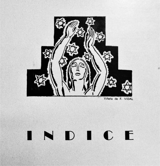 Junto a la imagen realizada para presentar la colección completa de las revistas, una viñeta del artista cordobés Francisco Vidal cerraba el índice (figura 4). La ilustración continuaba el estilo del trabajo de Warecki a través de la figura de una mujer con los ojos cerrados y sus brazos levantados en medio de un cielo con estrellas. Como podemos ver, los vínculos de Montes i Bradley con Córdoba no se circunscribían a su amistad con Juan Filloy. Una década antes de lanzar el Boletín, el escritor dirigió Directrices. Revista Mensual de Cultura Artística y Literaria, junto con Julio Romero del Prado y Eduardo Gómez Ybáñez. Allí los artistas Francisco Vidal, Onofrio Palamara y Sorine colaboraron con la ornamentación general de la revista, mientras Nicolás Antonio de San Luis realizó la carátula con la silueta de un arquero resuelta en trazos geométricos.