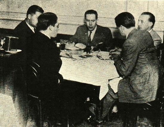 Algunas de esas peculiaridades que lo diferenciaban eran transferidas a sus publicaciones de circulación masiva donde podía experimentar propuestas estéticas y posiciones ideológicas. Por ejemplo, Boletín incluye su declaración editorial en un ejemplar de la segunda etapa que hacía un balance general y reproducía las tapas del resto de la colección.10 En dicha nota agradece a todos los artistas, periodistas, escritores, conferencistas y profesores que contribuyeron con el envío de textos o dibujos. Estas colaboraciones generaron un entramado que continuó desarrollándose a través de otros circuitos. Incluso distintas figuras del escenario cultural aparecieron en las fotografías de Boletín compartiendo reuniones o ideando nuevas propuestas editoriales, como puede verse, por ejemplo, en una de las instantáneas en donde Montes i Bradley, Fausto Hernández, Alfredo Laborde, Leónidas Gambartes y Ricardo Warecki preparan en la mesa de un café el volumen de los Cuadernos del Litoral dedicado a Pampa (1938), la primera parte de la trilogía poética de Fausto Hernández titulada In Mente (figura 5).