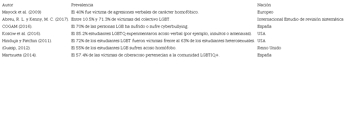 Por otra parte, no se debe obviar cómo el cyberbullying LGBTIQ+ fóbico también se puede desarrollar en las instituciones educativas mediante acciones y políticas basadas en los estereotipos y sin un planteamiento inclusivo. En este sentido, Pichardo8 recuerda cómo la homofobia no opera en lo irracional o en el subconsciente, sino que es un prejuicio construido socialmente en el que se aprende a rechazar la diversidad. En este sentido, es necesario referenciar como Cifuentes9 explica los tres conceptos esenciales en la configuración de comportamientos y actitudes LGBTIQ+ Fóbicos: a) estereotipos, siendo estos entendidos como simplificaciones y asociaciones de ideas,10 b) actitudes, siendo estas la organización de creencias y cogniciones,11 y c) prejuicios, siendo una predisposición negativa hacia un colectivo.12 Por otra parte, Dunn et al.13 exponen que la misoginia o la aversión a la feminidad es un elemento de riesgo en la aparición del acoso, pudiendo ser esta la causa de que las mujeres y hombres de minorías sexuales sufran en mayor medida acoso. Si bien otras investigaciones como Edwards et al.14 mostraron que la orientación sexual de las mujeres no modera el ciberacoso que sufren, estas eran en mayor medida víctimas en comparación con sus homólogos. Por otra parte, es necesario exponer cómo los hombres homosexuales tenían mayor probabilidad de sentirse amenazados que sus homólogos ante una situación de ciberacoso.15