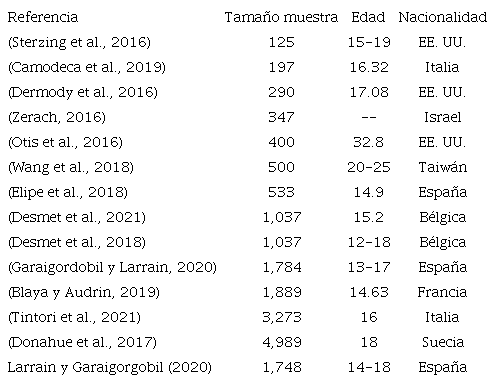Recientemente, entre los años 2016 y 2021, se han desarrollado interesantes investigaciones que persiguen la finalidad de estudiar en detenimiento la relación entre pertenecer a minorías sexuales y el ciberacoso. En total, la revisión sistemática se compone de 14 estudios con 15 muestras (una de las investigaciones es longitudinal) que suman un total de 38,164 adolescentes y jóvenes con una edad media de 17.72 años. En lo referente al tamaño de las muestras (véase Tabla 2), la más pequeña se compone de 125 y la mayor de 19,082 participantes. Además, la revisión aúna investigaciones europeas (Francia, Italia, Bélgica, España), norteamericanas (EE. UU. y Canadá) y asiáticas (Taiwan), tal y como se puede observar en la Tabla 3. En cuanto a la antropología, es necesario referenciar que la mayor parte de la muestra concierne a países europeos, siendo esto indicativo de la necesidad de estudio y concienciación en otras zonas geográficas.