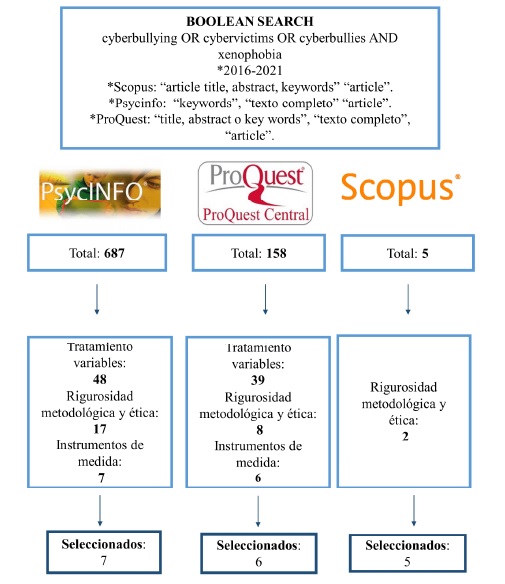 La estrategia de búsqueda. Esta se realizó en tres bases de datos: Psycoinfo, Scopus y Proquest. La búsqueda se efectuó en abril de 2021. Se seleccionó la siguiente acción booleana: “cyberbullying OR cybervictims OR cyberbullies AND xenophobia” (ver Figura 1).