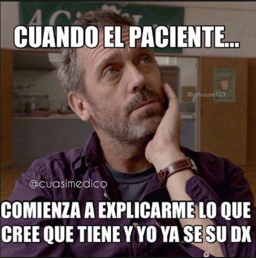 En este meme encontramos al Dr. House -protagonista de la famosa serie de televisión que lleva su nombre como título- en evidente demostración del paternalismo condescendiente: aparece escuchando con mucha tolerancia a pesar de que ya descifró cuál es el diagnóstico (abreviado como “dx” en el meme) de su paciente. Esta forma de paternalismo también está fundada en narrativas grupales que representan a los pacientes como ignorantes, irracionales, irresponsables e incompetentes, pero que preescriben condescendencia en lugar de autoritarismo. Como comentó una estudiante de medicina durante la entrevista: