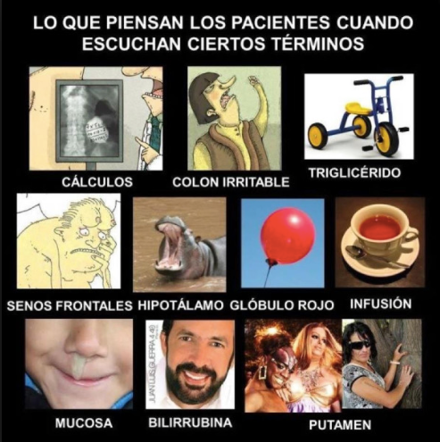 A mí me han tocado desde los abuelitos que no escuchan [y los atiendes por] primera vez. “¿Qué medicamentos toma?”, y sacan su bolsa y te sueltan allí en el escritorio un montón de cajas, “Todo esto”. O te dicen: “¿Qué toma para su diabetes?” -”Una pastilla grande y una chiquita” - “¿Cuáles?” -”Sí, una que tiene una rayita en medio”. Pues cuál será, ¿no? O le dices: “¿La han operado de algo?” -”No”. Pero vas avanzando [en la consulta y te dicen]: “Bueno, es que nada más me hicieron dos cesáreas” -”¿Por qué le hicieron cesáreas?” -”Pues porque estaba embarazada”, y yo, ah, sí, claro. Te tomas el tiempo de explicarles: “¿Tiene alguna duda?” -”Sí, ¿por qué me va a dar eso?” Toda la media hora o los diez minutos que te hayas aventado explicándole, no te entendieron nada, nada, nada. Entonces sí es cuestión de tenerles mucha paciencia (internista, 37 años, Ciudad de México).