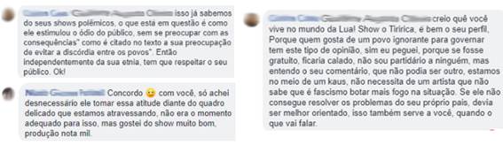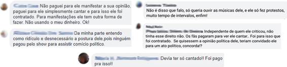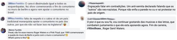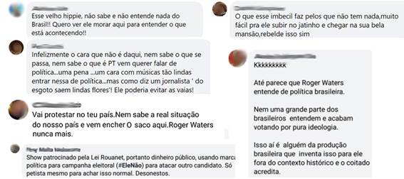 - Roger Waters botando lenha na fogueira: aqui, o incômodo aponta para a falta de cuidado de Roger Waters ao manifestar-se de tal forma em tal momento (levando em conta não só o período eleitoral, mas a instabilidade social), diante de milhares de pessoas num mesmo local, possibilitando a a) criação de uma desarmonia do público e levando à b) insegurança (Figura 4).