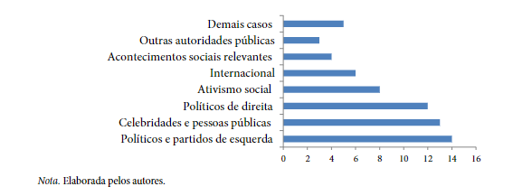 Em segundo lugar treze recorrências) se encontram textos que relacionam celebridades e pessoas públicas a falsos acontecimentos. Dentre eles, há histórias que insinuam um complô entre artistas e a mídia para deteriorar o cimento moral da família tradicional, a exemplo das narrativas que declaram que a cantora Pabllo Vittar apresentaria um programa infantil na TV Globo intitulado TV Criança Gay; que o cantor Johnny Hooker seria atração no Criança Esperança de 2019; ou que o youtuber Felipe Neto teria incentivado crianças a acessarem fóruns de pedofilia em seu canal. Outras publicações nessa categoria incluem materiais que legitimam formas de violência contra a mulher, inocentando os famosos envolvidos nos casos, como as insinuações de que a jovem que acusou o jogador Neymar de estupro, em maio de 2019, seria uma pessoa mal-intencionada; ou em texto que dá a entender que a ex-esposa do goleiro Jean, que atuava até dezembro de 2019 no São Paulo Futebol Clube, havia sido agredida pelo marido por ter enviado fotos íntimas para outros homens pelo WhatsApp.