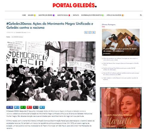 A recorrência dos termos mencionados e de temáticas que apontam para desafios vivenciados pela população negra nos sites negros vai ao encontro do que defende Guimarães (2012) ao discutir a cidadania negra, destacando a importância de se avançar na denúncia do racismo e das práticas racistas estruturadas na sociedade, para que essas possam ser “combatidas” (p. 37). Em outras palavras, a imprensa negra contribui com a exposição crítica de práticas racistas a partir de uma abordagem atenta dos direitos de cidadania, como no caso da matéria sobre o genocídio negro que ocorre, sobretudo, nas áreas periféricas das grandes cidades e que tem sido reportado de modo tendencioso e sensacionalista pela imprensa tradicional.