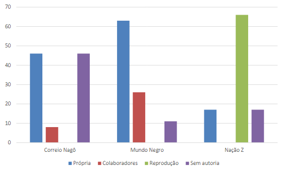 Quanto à autoria das publicações, foi possível observar, conforme a Figura 2, uma proporção considerável de conteúdos próprios produzidos pelos sites Correio Nagô e Mundo Negro, com 46% e 63%, respectivamente. Já no Nação Z, apenas 17% dos conteúdos são de autoria própria. A autoria própria aponta para a autonomia do veículo de comunicação em relação à produção de conteúdo.