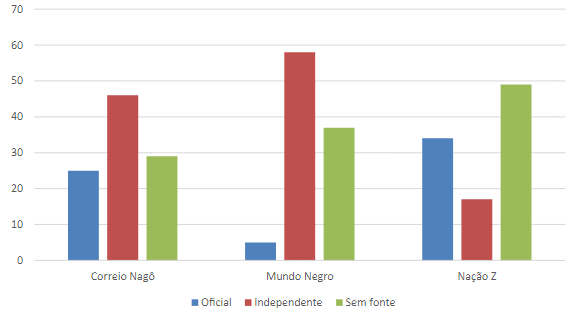 Na contramão do que ocorre na imprensa tradicional, especialmente ao discorrer sobre questões étnico-raciais, as fontes oficiais foram utilizadas de forma minoritária nos sites negros. Conforme Araújo e Silva (2017, p. 13), a maior parte das matérias sobre a temática racial dos sites G1 e R7 utilizam exclusivamente fontes oficiais para a elaboração das matérias. Já na imprensa negra, apenas 25% das publicações do Correio Nagô utilizaram fontes oficiais, 5% no Mundo Negro e 34% do Nação Z, o que aponta para uma independência desses canais em relação aos órgãos oficiais no que se refere à produção de conteúdos.