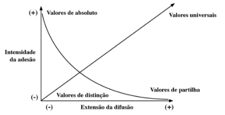Na Figura 1 temos duas possibilidades de relação entre valores absolutos e universais. Na curva descendente os absolutos são, por exemplo, aqueles relativos a situações em que um grupo social constrói a pertinência ao grupo excluindo aqueles que não partilham esses valores; os valores de partilha, por outro lado, operam pela inclusão daqueles que inicialmente não estavam incluídos no grupo. De início dominam os valores absolutos; à medida que há adesão aos valores de partilha, há espalhamento pelo campo de presença, cai a intensidade e aumenta a difusão da partilha. Na curva ascendente temos as outras situações mencionadas por Fontanille (2019), excluídas no modelo de Zilberberg. Esta proposta permite também adesões individuais e frágeis, maciças e intensas (dadas na reta ascendente), que não tinham lugar no modelo de Zilberberg (em que só havia a curva descendente). Daí resultam dois tipos para os valores de universo: “por um lado, valores universais, de adesão forte e maciça, e, por outro lado, os simples valores de partilha, amplamente difundidos, mas fracamente assumidos” (p. 151). Nesse diagrama a intensidade afetiva de uma força pode ser reiterada, ou seja, ampliada pela extensividade, pela duração e repetição (número de ocorrências). “A duração e a frequência são inclusive, aqui, indicações da potência e da profundidade do afeto” (p. 151).