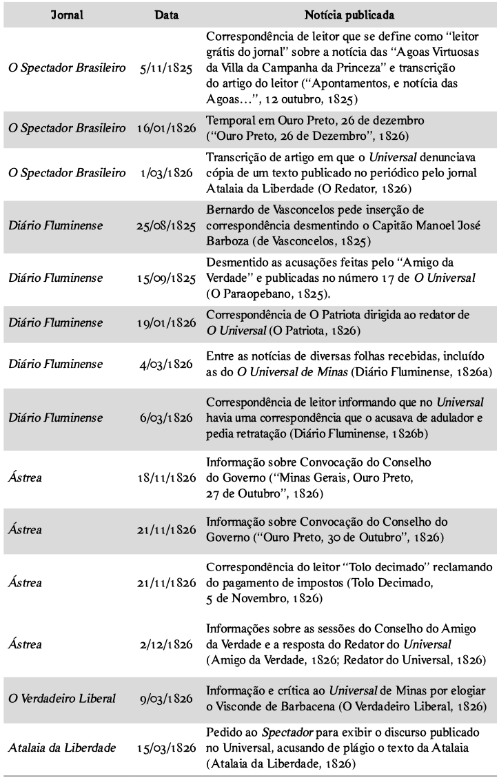 Assim, transcrevendo informações que tinham sido “extraídas do Universal” ou indicando ao final do texto o nome do periódico que originalmente a publicara, anotamos nos anos 1825 e 1826, nos jornais da Corte, a publicação de sete extratos/referências do jornal mineiro em O Spectador Brasileiro, cinco no Diário Fluminense, quatro na Ástrea, uma em O Verdadeiro Liberal e uma em Atalaia da Liberdade, conforme a Tabela 1.