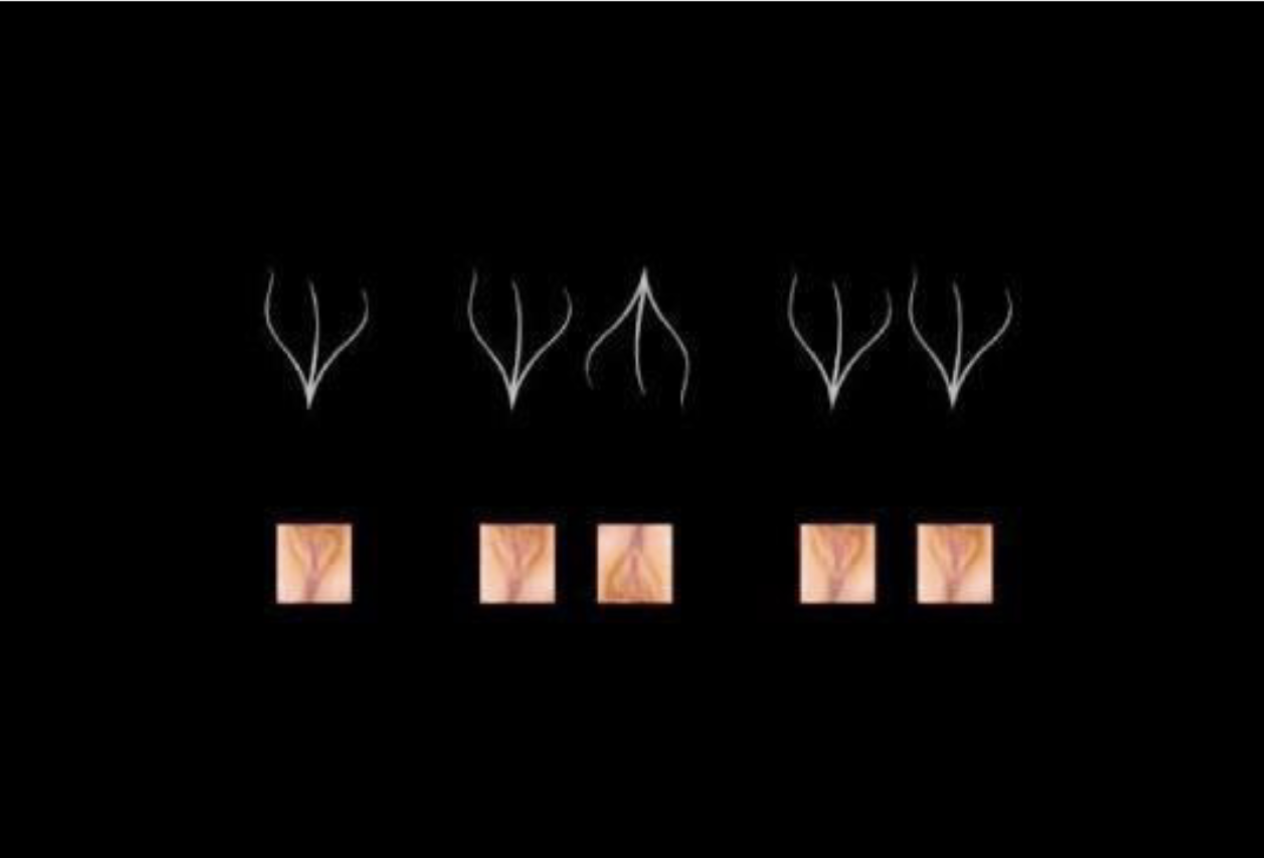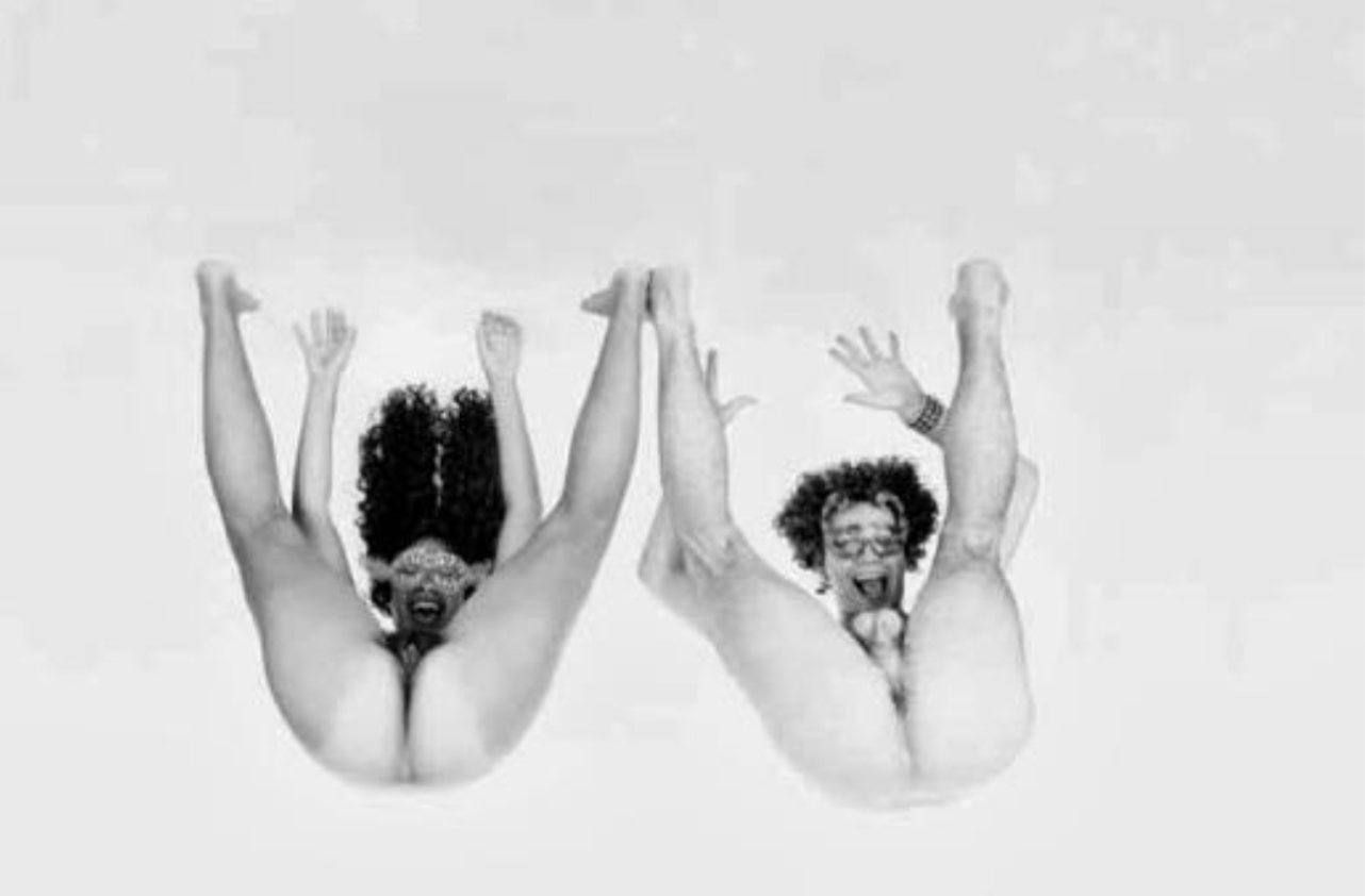 O caráter experimental dos Pornogramas vai muito além do uso da fotografia como um elemento visual impuro, ao tratá-la não apenas como referência a um objeto pré-existente (na maior parte das vezes corpos nus), mas também como signos linguísticos verbais, que criavam segundos sentidos não-referenciais para a imagem. É o caso, por exemplo, do Pornograma II (Figura 1), em que os corpos formam a letra “U” duplicada, sugerindo o som de uma vaia. Os rostos, tão importantes na tradição fotográfica retratista, estão encobertos por máscaras, e o primeiro plano é tomado pelas nádegas e genitálias do casal. A mesma transformação da imagem em signo linguístico pode ser percebida, de forma talvez mais evidente, em Pornogramas VI (Figura 2). Nesse trabalho, a vulva feminina adquire a forma de um “V” com “I” ou de um “M”, a depender da posição. O sequenciamento das fotografias e sua estilização permitem ler, então as palavras: “Vi, Vim, Vivi” (Kac, 2013, p. 44). O caráter textual da imagem fotográfica a lança para além da referencialidade, além de criar uma dimensão temporal que diz respeito ao ritmo da leitura e aos múltiplos sentidos que a poesia proporciona.