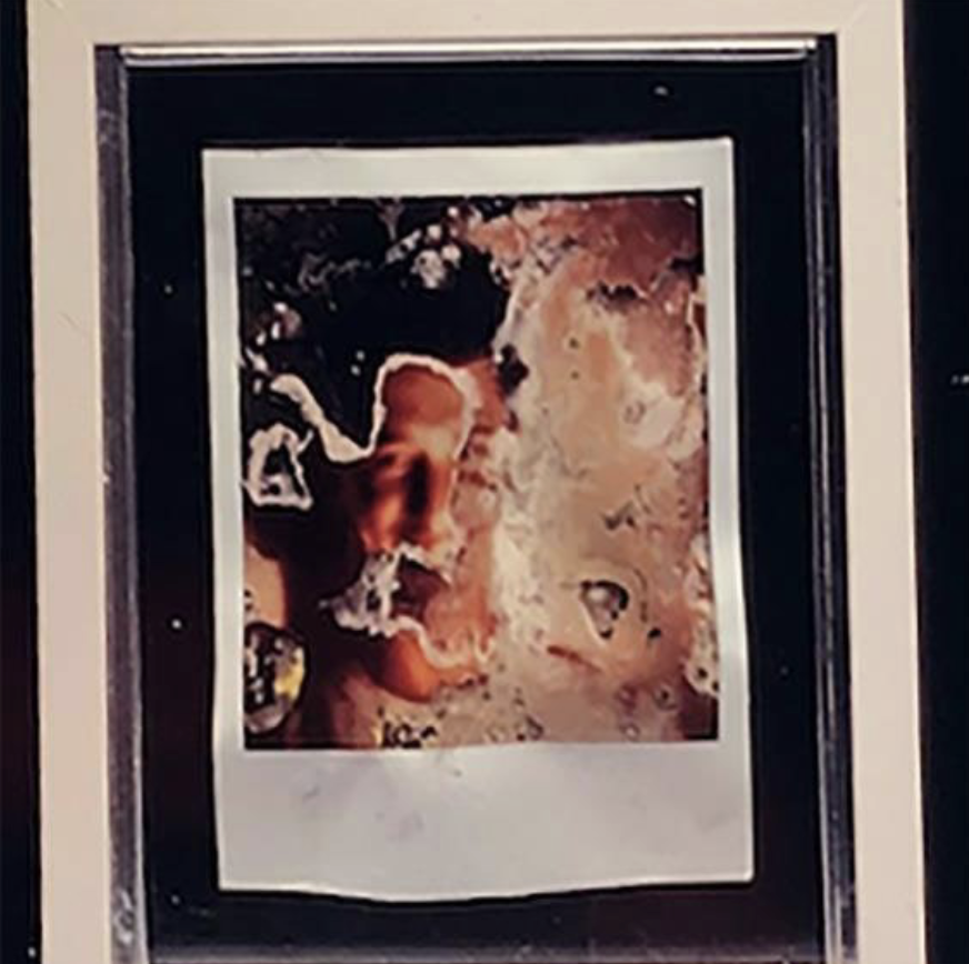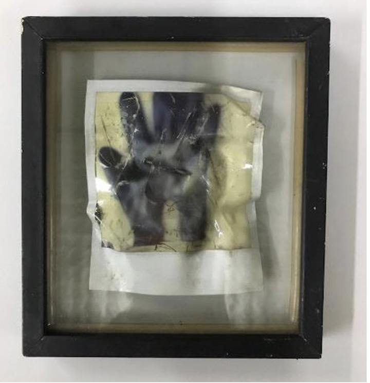 O modo radical de trabalhar e interrogar os limites do corpo durante as experimentações visuais foi marca inequívoca dos trabalhos artísticos de Eduardo Kac no contexto da chamada Geração 80. Para Kac, o corpo era uma interface a ser trabalhada segundo uma variedade de práxis que compreendiam os seus sons e os seus movimentos, as suas formas e as suas funções, e os comportamentos individuais ou sociais (Kac, 2013, p. 32). Na Figura 5, é possível perceber vestígios do que poderia ser uma pequena estatueta em que dois corpos, possivelmente humanos, se unem em um ato libidinoso, ainda que não possamos ver com clareza por conta dos muitos arranhões e rabiscos sobre o papel fotográfico, incluindo a moldura característica do formato Polaroid. E na Figura 6, percebemos a sombra da mão de alguém, quase um fotograma dessa mão, com pouquíssima visibilidade, sem nenhum detalhe, apenas uma forma em processo de dissolução, não fosse o prego no centro da imagem atravessando a materialidade do papel. Todas as imagens em Polaroid feitas por Kac guardam os vestígios da manipulação do artista: cortes, rabiscos, manchas, bolhas, impressões digitais. São interferências diretas sobre a materialidade da imagem, produzindo um apagamento parcial da cena, porém criando uma outra camada para a observação, capaz de pôr em dúvida o registro, questionando o que a imagem fotográfica realmente pode nos dar a ver, tanto quanto a própria tarefa de fotografia.