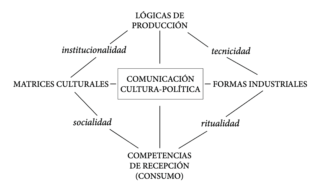 As relações entre Matrizes Culturais e Lógicas de Produção encontram-se mediadas por diferentes regimes de institucionalidade, enquanto as relações entre Matrizes Culturais e Competências de Recepção (Consumo) estão mediadas por diversas formas de socialidade. Entre Lógicas de Produção e Formatos Industriais medeiam as tecnicidades e entre os Formatos Industriais e as Competências de Recepção (Consumo), as ritualidades medeiam (Martín-Barbero, 2003, pp. 16-21). É o que pode ser representado graficamente a seguir:
