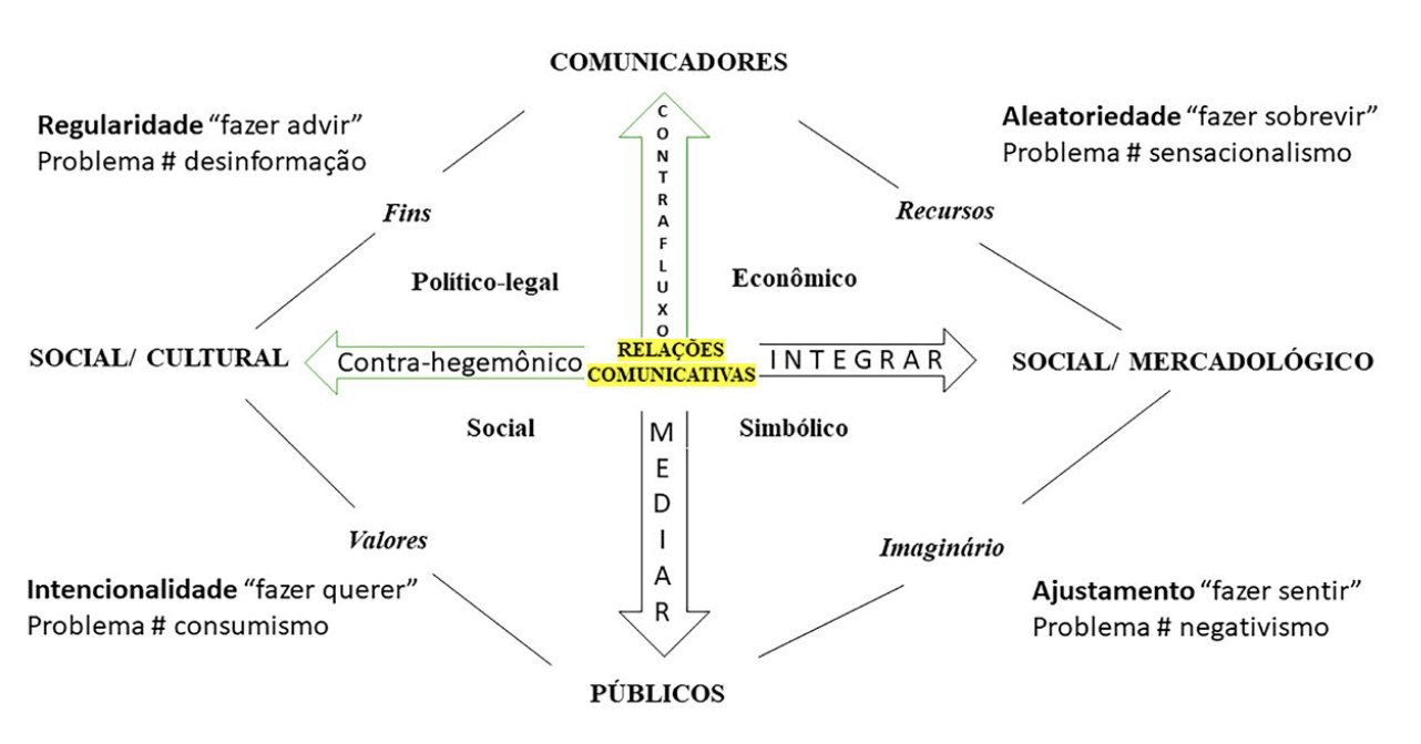 Destaque-se que a Perspectiva dos Públicos envolve “para quem”: consumidores e/ou cidadãos e outros e abrange questões de recepção e, no sentido da perspectiva Social/Mercadológica, refere-se à vida simbólica em função de obtenção dos fins, desempenho de papéis e o subsistema personalidade, relacionando-se ao imaginário, ao sensível, e à “lógica da sensibilidade e às relações interativas de ajustamento”. A perspectiva Social/Mercadológica está relacionada ao “como” e abrange a gestão estratégica da comunicação integrada, as forças macroambientais econômicas e, em direção ao eixo Comunicadores, está relacionada às forças econômicas, aos recursos e à lógica de aleatoriedade e às relações de interação de risco e acidente (Landowski, 2014).