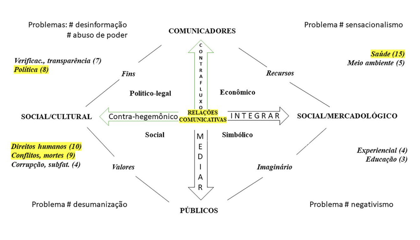 Na dimensão simbólica destacam-se a visualização, o imaginário e a educação que se projetam pelo noticiário. No entanto, não podemos negar o viés do negativismo no noticiário, que visualmente pode ser incluído na dimensão político-legal, ao lado da desinformação e do abuso de poder. Isso sugere que as dimensões se interpenetram e têm ligações entre si. Assim, pode-se evidenciar que o simbólico tem também uma valência negativa muito presente no jornalismo.