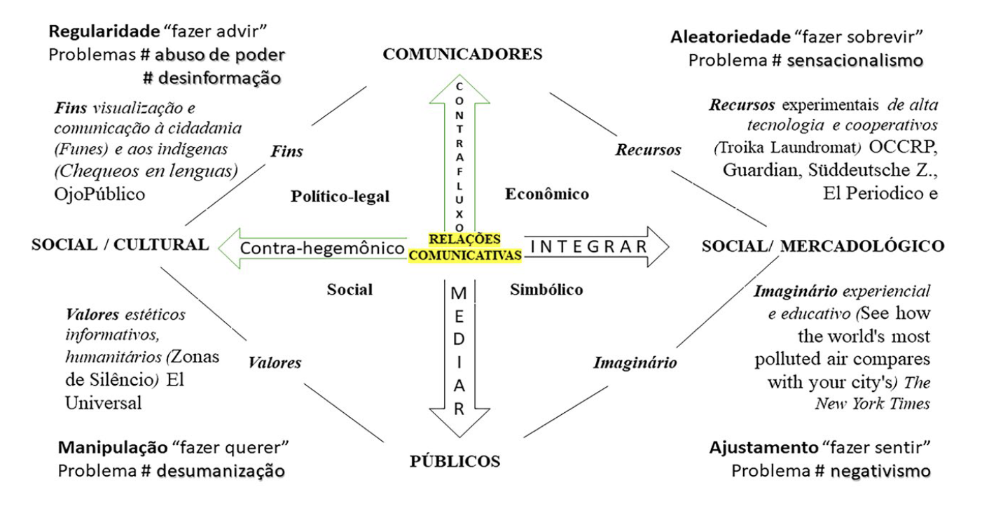 OCCRP, Guardian, Süddeutsche Zeitung, Newstapa, El Periodico, Global Witness e outros 17 parceiros foram os vencedores na categoria melhor reportagem do Sigma Awards 2020 com o projeto noticioso “A Troika lavanderia de capitais” (OCCRP et al., 2020). Quanto às possíveis relações comunicacionais que se estabelecem, os indivíduos Paul Radu, Sarunas Cerniauskas, Olesya Shmagun, Dmitry Velikovsky, Alesya Marohovskaya, Jason Shea, Jonny Wrate, Atanas Tchobanov, Ani Hovhannisyan, Irina Dolinina, Roman Shleynov, Alisa Kustikova, Edik Baghdasaryan e Vlad Lavrov, que compõem o coletivo de atores sociais “Comunicadores” do Organized Crime and Corruption Reporting Project (OCCRP), The Guardian, Süddeutsche Zeitung, Newstapa, El Periodico, Global Witness e outros 17 parceiros, mantêm uma relação cidadã com indivíduos que compõem o coletivo de atores sociais “Públicos”, e divulgam o projeto noticioso Troika Laundromat com viés investigativo a partir de recursos de visualização e comunicação, alta tecnologia e informativo sobre a corrupção na Rússia e suas práticas de lavagem de dinheiro na Europa. Isso é colocado à disposição dos cidadãos em uma determinada sociedade (europeia), uma vez que, embora sejam proibidos de divulgar na Rússia, os “Comunicadores” têm amparo legal, fruto de relação que mantêm com os governos europeus e de outros países, que os autorizam a desencadear uma relação mediada de comunicação visando a atingir os “Públicos” para divulgar notícias e alertas sobre a corrupção na Rússia e suas conexões de lavagem de dinheiro na Europa. Com o projeto, procuram, da perspectiva “Social/Cultural”, que os “Públicos” venham a “fazer sobrevir” sanções contra o sistema de lavagem de dinheiro da corrupção da Rússia com a cumplicidade de bancos europeus. Isso se constitui iniciativa contra-hegemônica, sem propósito comercial, o que foi proposto pelos indivíduos que compõem o coletivo de atores sociais comunicadores do “Mercadológico institucional” das instituições que compõem o coletivo investigativo coordenado pelo projeto OCCRP com muitas parcerias. Apesar de ser um projeto com viés sensacionalista, que foi premiado como “melhor reportagem do Sigma Awards 2020”, no entanto não se evidencia intenção mercadológica. O projeto constitui-se uma forma de atuação cidadã, de forma a virem os internautas a se tornar conscientes ou conscientizados sobre os possíveis riscos de o sistema bancário europeu se tornar uma imensa lavanderia de dinheiro da corrupção russa, sem que, no entanto, venham a integrar o “Mercadológico”, prevalecendo cidadania no “Social/Cultural”. Analisando os interesses, trata-se de prática contra-hegemônica de produção de discursos cuja hegemonia encontra-se do lado dos interesses coletivos, com o propósito de informar o “Público” sobre a corrupção russa e a lavagem de dinheiro pelos bancos europeus. O projeto está relacionado de forma predominante ao “regime de interação de risco” (Landowski, 2014, p. 80), baseado na aleatoriedade e no risco de possível “descontinuidade” de relações interativas voltadas à lavagem de dinheiro da corrupção, o que está relacionado ao “risco” de as interações ilegais dos corruptos e de suas conexões para lavagem de dinheiro serem descobertas, o que constitui um problema relacional entre as sociedades russa e europeia. É algo que exige ações cidadãs para denunciar e conter as relações comunicacionais desviantes e que envolve riscos de descoberta do fluxo de lavagem do dinheiro da corrupção russa.