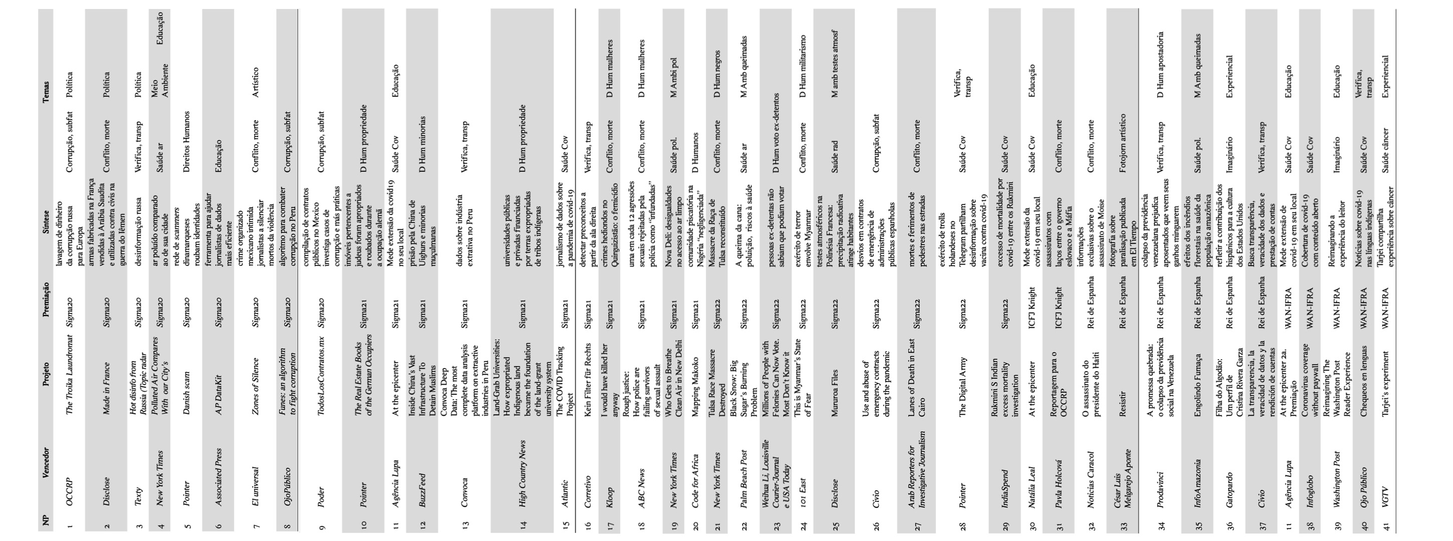 Do exposto, destaca-se que o Mapa relacional se baseia em Martín-Barbero (2003) e está imbricado na teorização de Landowski (2014), a qual também pode ser adaptada para auxiliar a analisar as notícias. A partir de tal concepção teórica, o presente artigo propõe-se a realizar um mapeamento das premiações jornalísticas internacionais, e, para tal, inicia a seguir as análises discursivas das 41 premiações (vencedores – projetos – temas) que estão sintetizadas nas planilhas reproduzidas parcialmente nas figuras seguintes e que serão comentadas adiante, nos resultados.