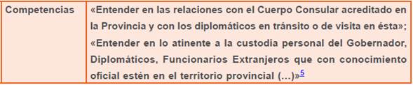 La interpretación sobre estas competencias puede hacerse en clave realista: se trata de asuntos de "alta política", por razones de seguridad nacional y protección de representantes diplomáticos y funcionarios en territorio provincial. A nuestro entender, esta competencia reconoce parcialmente los distintos actores de la compleja sociedad internacional, cuando se refiere a funcionarios extranjeros que transitan y visitan la provincia.
