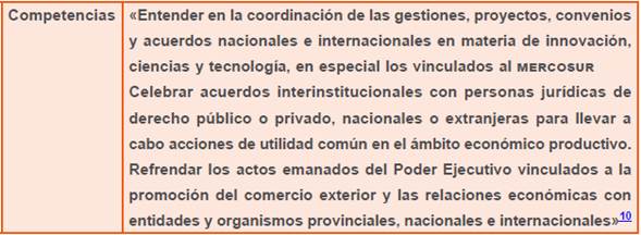 La Ley reconoce la relevancia del Mercosur para el desarrollo productivo, científico y tecnológico de la provincia, siendo el Ministerio de Producción el único que explícitamente tiene competencias para refrendar lo actuado por el Poder Ejecutivo en el campo del comercio exterior y de las relaciones económicas internacionales. En relación al bloque sudamericano, no se hace alusión a la dimensión subnacional de los procesos de integración en los cuales participa la provincia, por ejemplo CRECENEA y Región Centro, tan relevantes para la conformación de los llamados corredores bioceánicos.