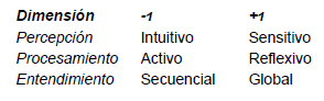 Cabe notar, que el resto de dimensiones presentan también un nivel de importancia, pero se debe tener presente, que el proceso inicial de aprendizaje es una actividad que se aborda de manera individual y personalizada. Para tal efecto se plantea que los estilos de aprendizaje a determinar van encaminados en esas dos dimensiones, agrupados de la siguiente manera: Visual-Global (vis-glo), Visual-Secuencial (vis-sec), Verbal-Global (ver-glo), Verbal-Secuencial (ver-sec). Para ello se toman 14 preguntas (del total de 44), agrupadas en subgrupos de 7 preguntas (Visual-verbal, Secuencial-Global).
