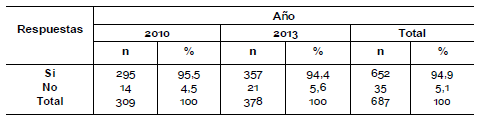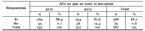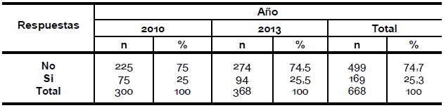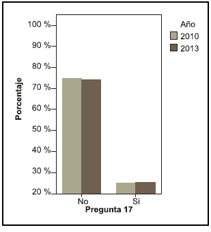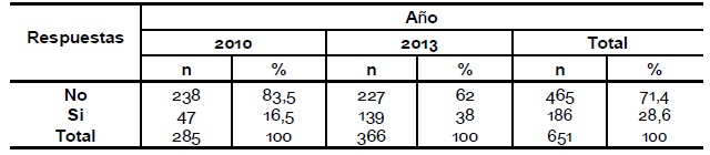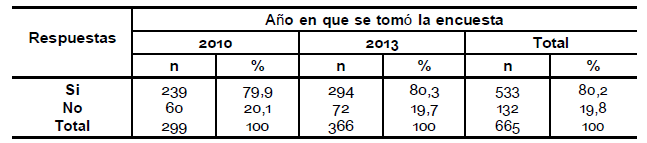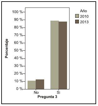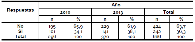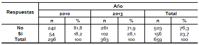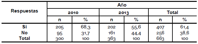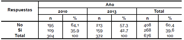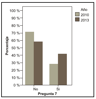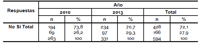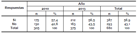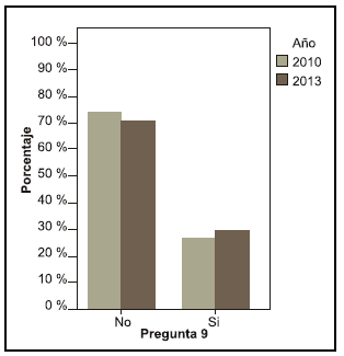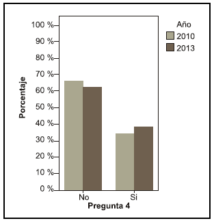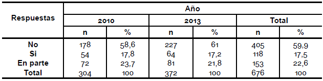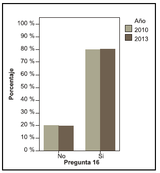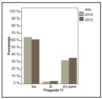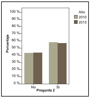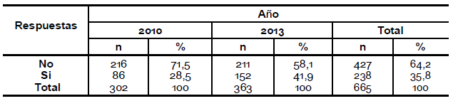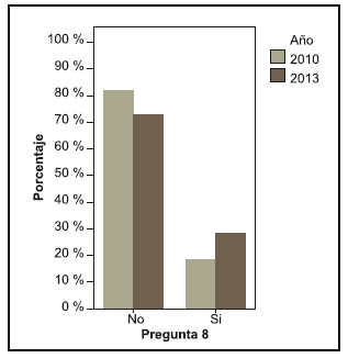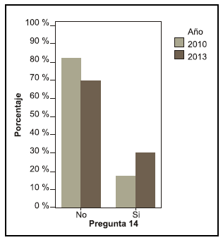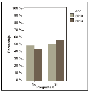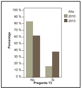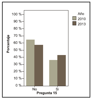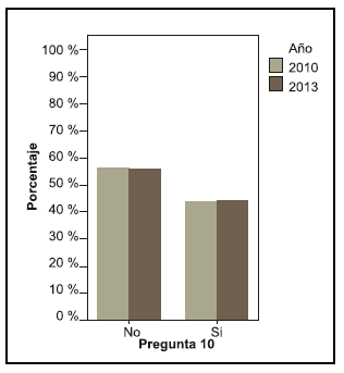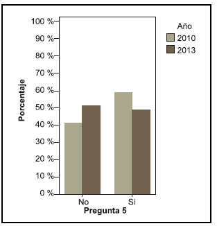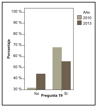 Se puede observar una diferencia entre los años en la pregunta acerca de si le interesaría saber más sobre el tema, en el año 2010 el 68, 4 % contestó que sí le interesaría mientras que en el año 2013 el 55,6 % (pregunta 19).