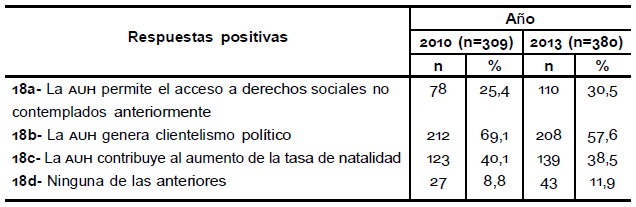 En la pregunta de respuesta múltiple número 18, el encuestado debía seleccionar la frase con la que concordaba. El docente podía marcar más de una opción. Ante la frase acerca de si «La auh permite el acceso a derechos sociales no contemplados anteriormente», el 25,4 % de la muestra estaba de acuerdo en el 2010 y el 30,5 % en el 2013. La oración «La auh genera clientelismo político» fue seleccionada por el 69,1 % (2010) y el 57,6 (2013) de la muestra. El 40,1 % en el 2010 y el 38,5 en el 2013 seleccionó la frase: «La auh contribuye al aumento de la tasa de natalidad».