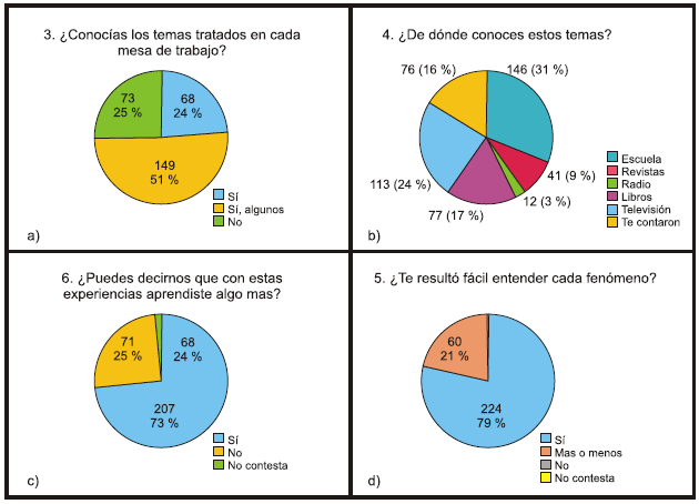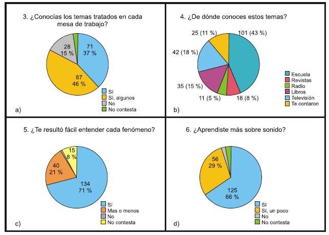 El propósito de la encuesta fue la de recabar opinión del sector estudiantil en tres cuestiones que nos interesó conocer: a) el gusto por la ciencia, por el trabajo experimental, por los fenómenos físicos y la observación microscópica; b) el conocimiento de los temas abordados (saberes previos) y las fuentes de información que usan preferentemente para conocer sobre ellos; c) la predisposición y ánimo a realizar y reproducir por sí solo las experiencias realizadas. A través de la recolección de esta información se pudo evaluar el impacto de esta actividad didáctico-pedagógica y el grado de cumplimiento de los objetivos propuestos por el equipo de trabajo. Contabilizamos un total de 695 alumnos encuestados de distintos niveles educativos. Para el kit completo de experiencias (óptica, visión, electricidad y magnetismo) se obtuvieron 297 encuestas, para el taller «Observatorio Microscópico» 208 encuestas y para el taller de sonido un total de 190 encuestas.