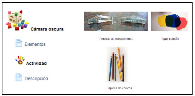 Las diferentes experiencias publicadas en la plataforma se diseñaron con una iconografía sencilla de interpretar y organizadas en dos subsecciones en las que, por un lado, se indican para cada experiencia los materiales necesarios para llevarlas a cabo y por otro, una descripción del fenómeno que se quiere mostrar con ello. Los elementos allí mostrados son de fácil obtención y de muy bajo costo, tales como los que se ilustran en la Figura 9.