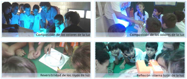 Kit de Óptica: Propagación, reflexión y refracción de la luz. Reflexión interna total. Reversibilidad de los rayos de luz. Construcción de un periscopio usando a) espejos planos y b) prismas de reflexión total. Composición y descomposición de la luz blanca (luz del sol) con el uso de prismas triangulares de vidrio para dispersión. Formación del espectro visible: arco iris. Colores de la luz, síntesis aditiva y sustractiva de colores y producción del blanco y del negro mediante el uso de un equipo lumínico tricolor con los tres colores primarios de la luz y de filtros de papel celofán para los colores primarios (rojo, verde, azul) y complementarios (amarillo, magenta, cian). Sistema visual humano: experiencias para trabajar los conceptos de: campo visual, agudeza visual, puntos próximo y remoto, percepción de los colores. La Figura 3 muestra algunas imágenes de la guía orientativa de cómo el alumno puede desarrollar la experiencia y fotos alusivas.