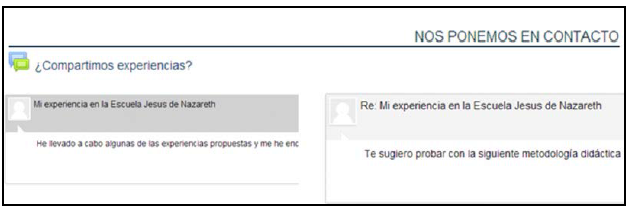 La sección nos ponemos en contacto fue pensada para facilitar la colaboración entre los docentes, se dispuso de un foro que permita acciones colectivas para proponer, contrastar y debatir ideas, potenciar las diferentes propuestas de experiencias planteadas en el proyecto como así también planificar actuaciones e intervenciones educativas tomando como base disparadores surgidos desde los kit de experiencias brindados. El foro como herramienta de comunicación asincrónica se planteó de manera abierta, a los efectos de permitir interacciones de diferentes hilos de discusión y de esta forma crear un ambiente flexible de comunicación. Ingresando al foro se pueden notar unos de los hilos de discusión, como se observa en la Figura 11.