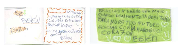 «Querida Virginia, te escribo para agradecerte por la maravillosa jornada que nos hicieron pasar. Queremos hacerte saber además, que todo el grupo que participó en el mismo se sintió especialmente conmovido por no sólo las riquísimas experiencias realizadas para con los niños, sino también por la altísima calidad humana demostrada por vos y tu equipo. Un fuerte abrazo.»