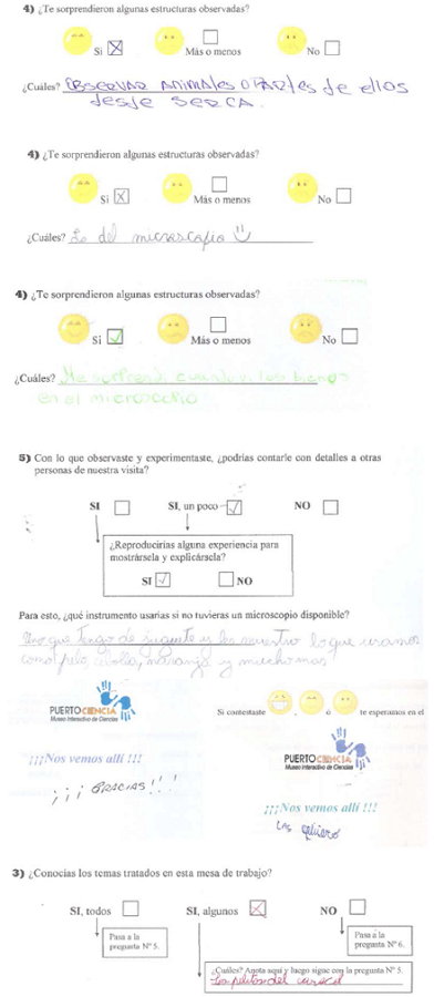 Tanto para alumnos de primaria como de secundaria la observación microscópica resultó ser una actividad altamente atrayente, alcanzando un 95 % de aceptación. Lo que más atrajo la atención fue ver al microscopio un piojo vivo y una liendre. Sin haber pensado antes el provocar tal fin, la amplificación de las garras del piojo resultó en una «toma de conciencia» y en una «advertencia de higiene» al ver su aspecto. Se halló que un gran porcentaje de alumnos (51 %) conocía algunos de los temas tratados; muchos afirmaron conocer y/o haber visto con el microscopio en la escuela y en clases de Biología y algunos alegaban tener uno en sus hogares o en la casa de un pariente que lo utilizaba para trabajar.