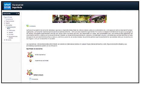 La organización del espacio virtual se realizó agrupada por secciones, una inicial de introducción, una segunda sección de experiencias, una tercera de escuelas visitadas y una cuarta de foros de contacto. Accediendo a la sección experiencias, los docentes que se registraron pudieron obtener información de las diferentes experiencias de física para poder recrearlas en sus aulas. Esta sección además moviliza la vinculación con los demás docentes que ya han realizado algunas prácticas, permitiéndoles entrar en diálogo de sus vivencias con los alumnos.