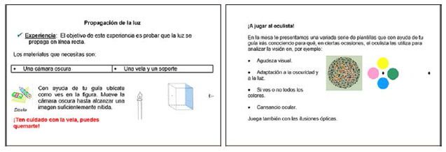 Por su parte, el interés por las actividades desarrolladas en la mesa llamada «Jugando con los colores» también fue alto y positivo, 22 %. Sorprendieron tanto a niños como a adolescentes los tres instrumentos ópticos fabricados por el equipo de trabajo: el caleidoscopio, el periscopio y la caja mágica (dispositivo que consta de 1 espejo por cada vértice de una caja cuadrada para permitir realizar sucesivas reflexiones ópticas). Su atractivo fue mayor en niños (51 %) que en adolescentes (43 %), resultando en un 18 % de aceptación general sobre el total de encuestados.