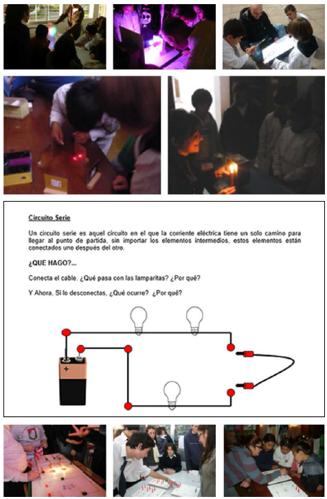 Kit de Electricidad y Magnetismo: Circuito serie, paralelo y mixto (circuito serie + circuito paralelo) + cortocircuito. Analogía mediante un circuito hidráulico que combina conexiones en serie, paralelo y llaves de paso, ilustrando elementos y conceptos comunes para establecer semejanzas y diferencias basadas en el razonamiento lógico. Electricidad estática: efecto triboeléctrico causado por inducción de la separación de cargas por contacto y por rozamiento de diferentes materiales. Identificación de los polos magnéticos de un imán y visualización de líneas de fuerza magnética mediante el uso de limadura de hierro. En la Figura 4 se observa una ficha de trabajo para Electricidad y algunas fotos de alumnos experimentando.
