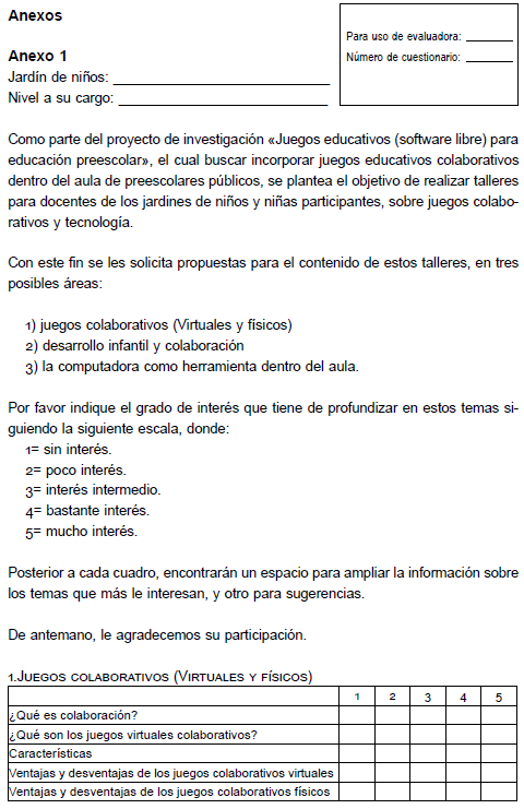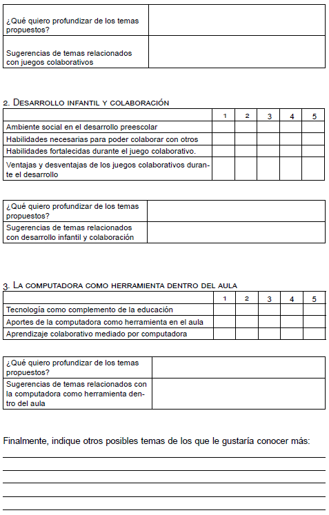 Para la capacitación, se diseñó un instrumento con el objetivo de que las docentes indicaran, previo al taller, algunas temáticas relacionadas con colaboración, desarrollo y tecnología. El instrumento fue auto aplicado y constó de una escala de 1 a 5 para indicar el nivel de interés en subtemas (Anexo 1). Además, había un espacio para preguntas abiertas. En esta fase, participaron 26 docentes en total (12 en una institución, 14 en la otra).