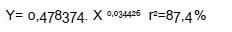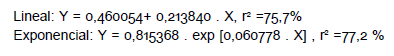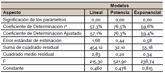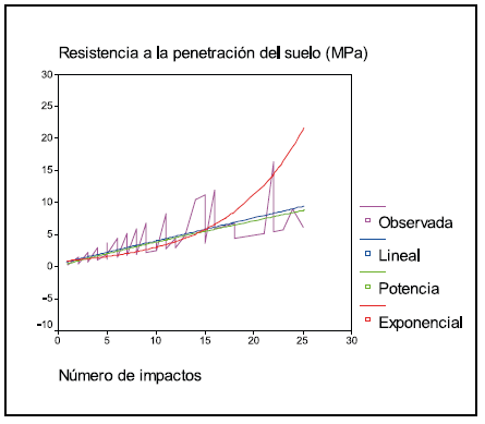 El coeficiente de alfa de Cronbach total del instrumento fue 0.74, superior al mínimo aceptable de 0.7 (Vallejo, 2007). Este valor muestra una fuerte relación entre el número de golpes y la resistencia a la penetración, al ejecutar el penetrómetro de impacto en campo. En consecuencia, el modelo «Potencia» es el que más se ajusta, teniendo en cuenta los diferentes indicadores estadísticos, según se observa en el Cuadro 1 y su correspondiente gráfico que se muestra en la Figura 5, siguiendo la ecuación que caracteriza el mismo: