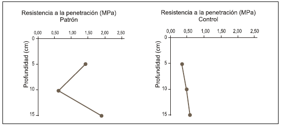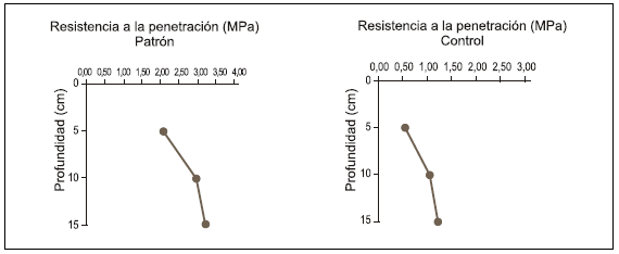 Los impactos necesarios para penetrar al suelo, en el perfil patrón de «Sabas Nieves», fueron el doble con respecto a los otros dos perfiles patrones. Igualmente, se observó en el perfil control, valores de resistencia cuatro veces mayores, en comparación con los valores de perfil control «Los Venados».