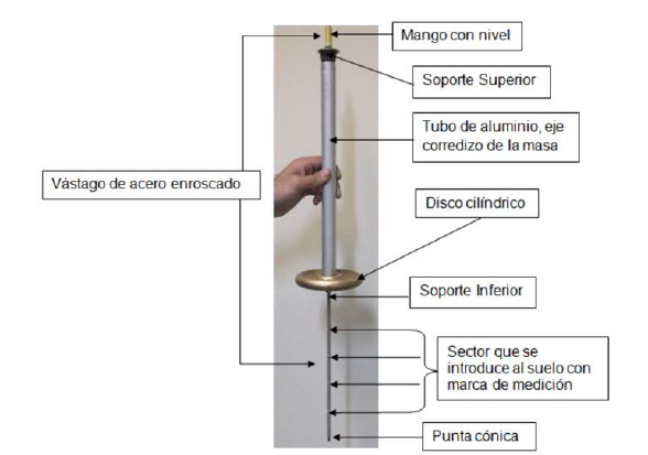 Para la construcción del equipo se utilizó una varilla cilíndrica de acero enroscada de 72 cm de longitud, y diámetro de 4 mm. La longitud de la varilla, se estableció conforme a un recorrido necesario de la pesa o masa de inercia, de inserción al suelo y colocación de mango para el operario (Figura 1). Desde el extremo desde el cual se suelta la pesa hasta la punta inferior de la varilla, se ubicaron tope superior y tope inferior utilizando arandelas de acero para el límite de recorrido de la pesa o masa, aseguradas con doble tuercas ajustadas al vástago o varilla que permiten incluso variar el recorrido total de la pesa. El largo total del recorrido se fijó en 37 cm. Se colocó un tubo de aluminio por encima de la varilla como guía de la caída libre de la pesa, permitiendo un apropiado deslizamiento. Por otro lado, el extremo superior de la varilla se colocó un mango de metal enroscado y sobre el mango un nivel de burbuja para garantizar la no actuación de fuerzas laterales entre el equipo y el suelo.