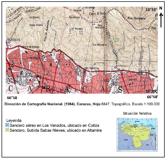 Las medidas de la resistencia a la penetración y toma de muestra se realizaron en los senderos: «Sabas Nieves» y en «Los Venados», ambos ubicados en el Parque Nacional Waraira Repano (El Ávila), urbanización Altamira y Cotiza respectivamente. El primero localizado a los 10°30′48″ y 10°31′47″ latitud Norte y entre los 66°51′13″ y 66°51′32″ longitud Oeste. El segundo localizado a 10°32′07″ y 10°32′21″ latitud Norte y 66°53′48″ y 66°53′49″ longitud Oeste (Figura 2).